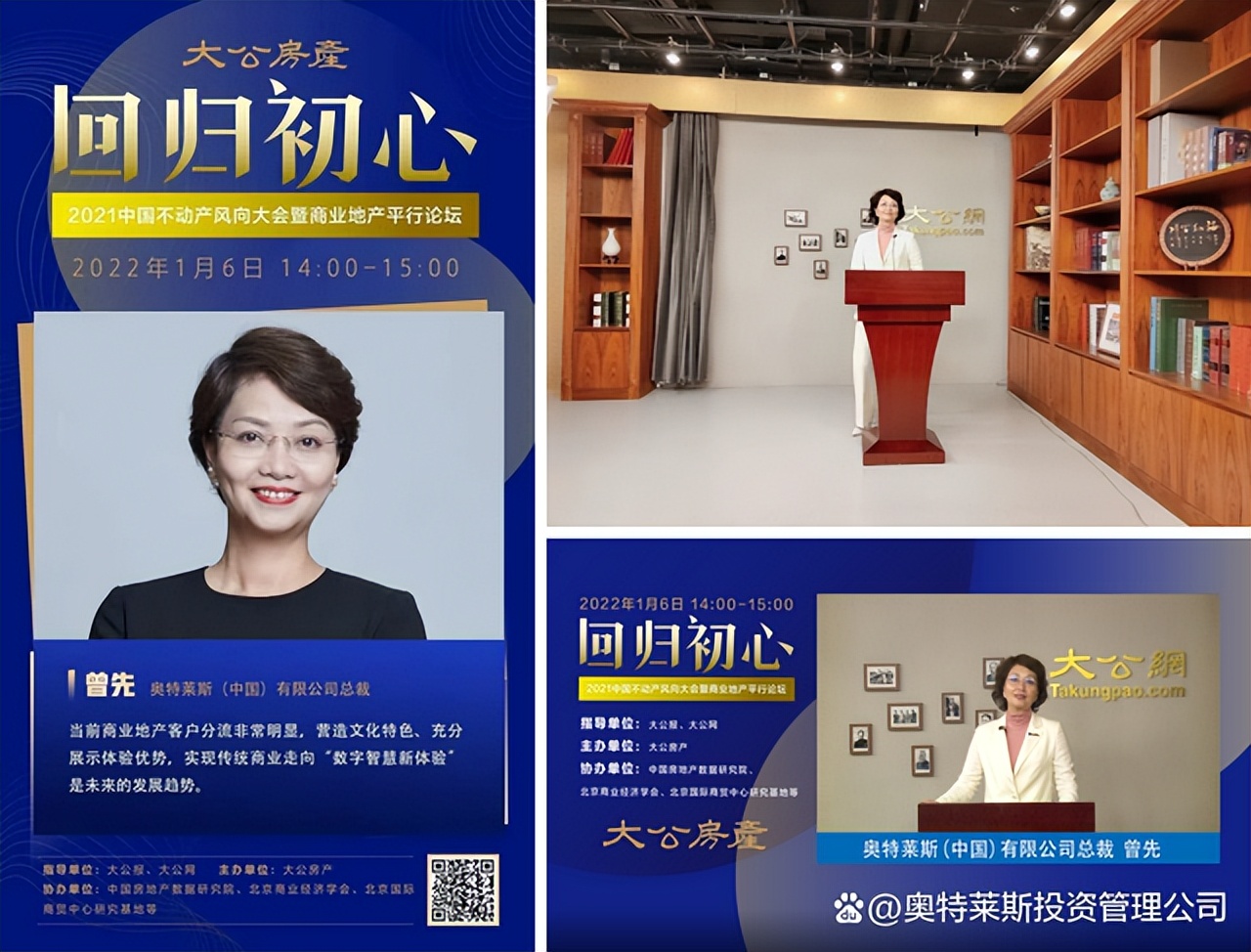 1月6日,由大公網(wǎng)房產(chǎn)頻道聯(lián)合多方機(jī)構(gòu)舉辦的“【回歸初心】——2021中國不動(dòng)產(chǎn)風(fēng)向大會(huì)暨商業(yè)地產(chǎn)平行論壇”線上直播活動(dòng)正式開始。奧特萊斯(中國)有限公司總裁受邀參加本次活動(dòng),并進(jìn)行了精彩的線上直播發(fā)言。