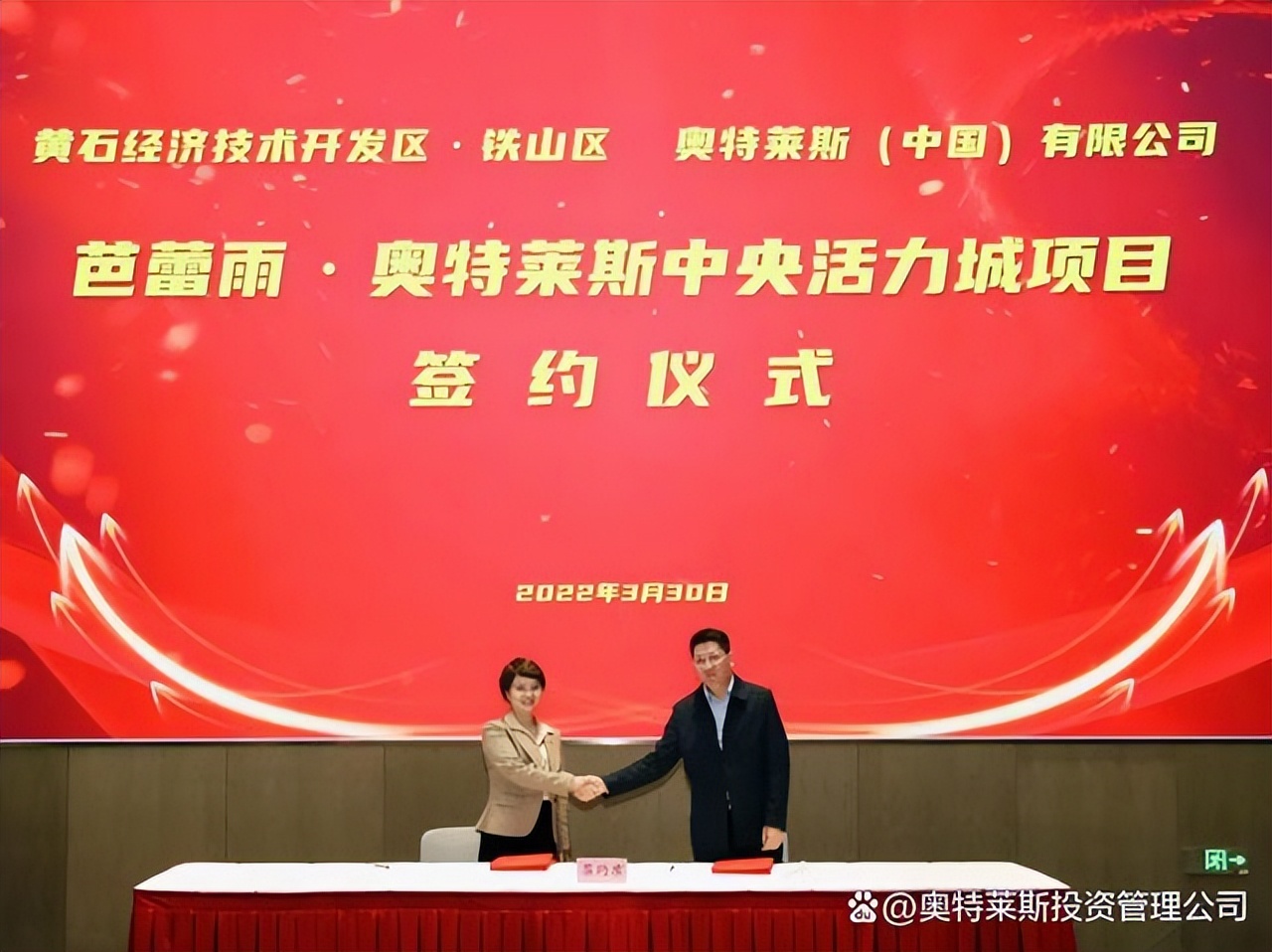 3月30日,奧特萊斯(中國)有限公司總裁拜訪黃石市政府,與黃石市吳之凌市長進(jìn)行會(huì)談,并與黃石市經(jīng)開區(qū)·鐵山區(qū)簽署“黃石芭蕾雨·奧特萊斯中央活力城項(xiàng)目”合作協(xié)議。黃石市政府、經(jīng)開區(qū)管委會(huì)·鐵山區(qū)政府相關(guān)部門,以及公司助理總裁李曉薩參會(huì)。