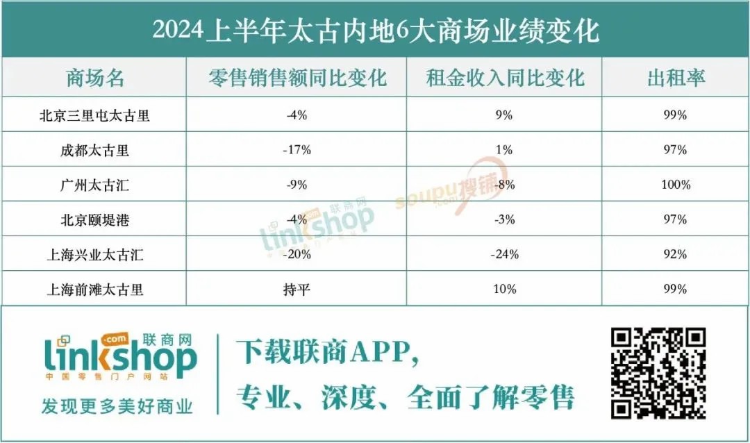 具體數(shù)據(jù)上,太古地產(chǎn)在內(nèi)地的六大主要商場中,上海前灘太古里表現(xiàn)平穩(wěn),零售銷售額與去年同期持平。然而,其他五大高端商場,包括北京三里屯太古里、成都太古里、廣州太古匯、北京頤堤港和上海興業(yè)太古匯,均出現(xiàn)了不同程度的銷售下滑。其中,成都太古里、廣州太古匯和上海興業(yè)太古匯的跌幅尤為顯著,分別達到17%、9%和20%,顯示出高端零售市場面臨的較大壓力。