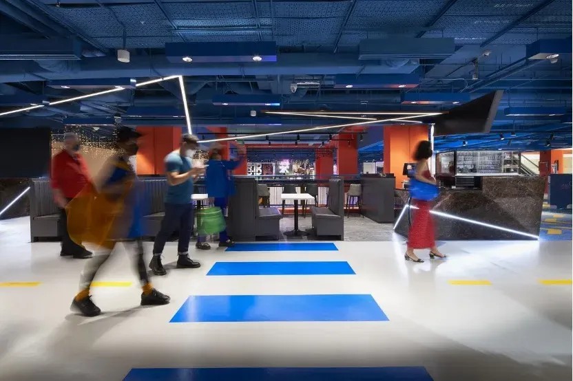 在空間優(yōu)化上,GRiD項(xiàng)目著重打造社交與活躍氛圍。通過(guò)引入“社交樓梯”理念,將傳統(tǒng)商鋪空間轉(zhuǎn)變?yōu)榧蓍e、交流與體驗(yàn)于一體的多元功能區(qū)。這些設(shè)計(jì)不僅增強(qiáng)了建筑的視覺(jué)吸引力和可識(shí)別性,還以鮮明的橙色、藍(lán)色及白色調(diào),為空間注入活力與現(xiàn)代感,使其在城市街角中獨(dú)樹(shù)一幟。