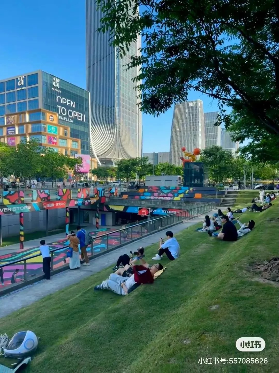 商業(yè)空間采用“主廣場(chǎng)+內(nèi)苑”形式,增設(shè)大量休憩空間,隨處可見的大階梯、特色樓梯、屋頂運(yùn)動(dòng)平臺(tái)、屋頂花園等公共場(chǎng)域,廣泛大面積的空曠、綠茵空間自帶社交屬性,讓來(lái)到這里的人們可以真正地坐下來(lái),談?wù)勑?、放輕松。