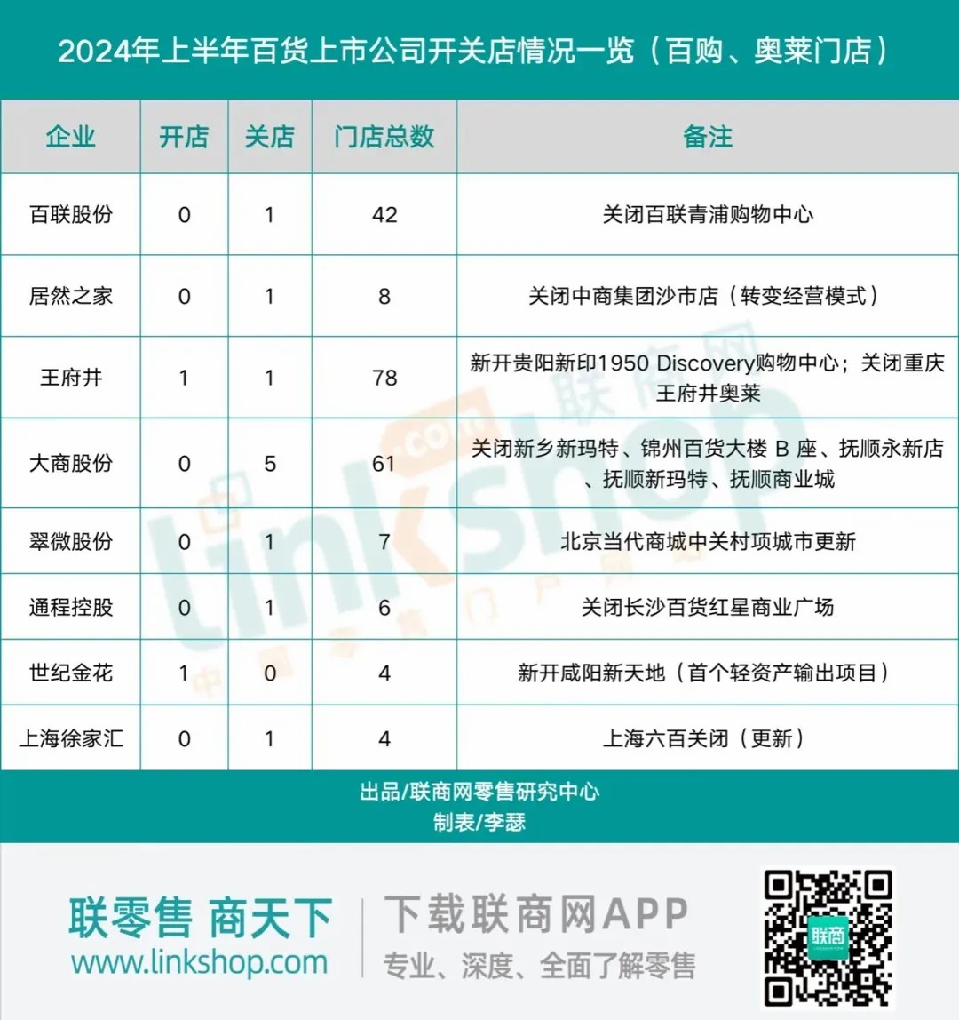 在門店的開設(shè)與關(guān)閉動(dòng)態(tài)上,2024年上半年呈現(xiàn)出一個(gè)顯著的趨勢:關(guān)店數(shù)量遠(yuǎn)超開店數(shù)量。具體而言,44家百貨上市公司在此期間僅新增了2家門店(此數(shù)據(jù)僅限于百貨商店、購物中心及奧特萊斯門店),而關(guān)閉的門店數(shù)量則達(dá)到了11家。與之形成對(duì)比的是,去年同期這些公司開關(guān)店的數(shù)量均為5家。這一變化表明,與去年相比,百貨上市公司在開設(shè)新店方面變得更加謹(jǐn)慎,而關(guān)閉門店的速度卻在加快。