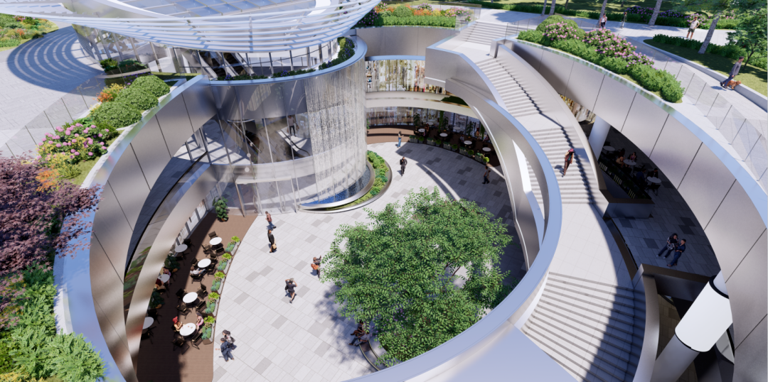 項(xiàng)目設(shè)計(jì)了若干下沉廣場,將地下空間向城市和公園界面開放,打造具有生態(tài)層次感的庭院-花園-公園,從而實(shí)現(xiàn)地下-地面-屋頂?shù)娜讓涌臻g規(guī)劃。不僅給到了項(xiàng)目和品牌乃至這個(gè)城市更多的場景敘事和想象空間,同時(shí)也給消費(fèi)者帶來了更多更豐富的社交空間、沉浸體驗(yàn)空間,最終打造了一個(gè)完美的生態(tài)場域。